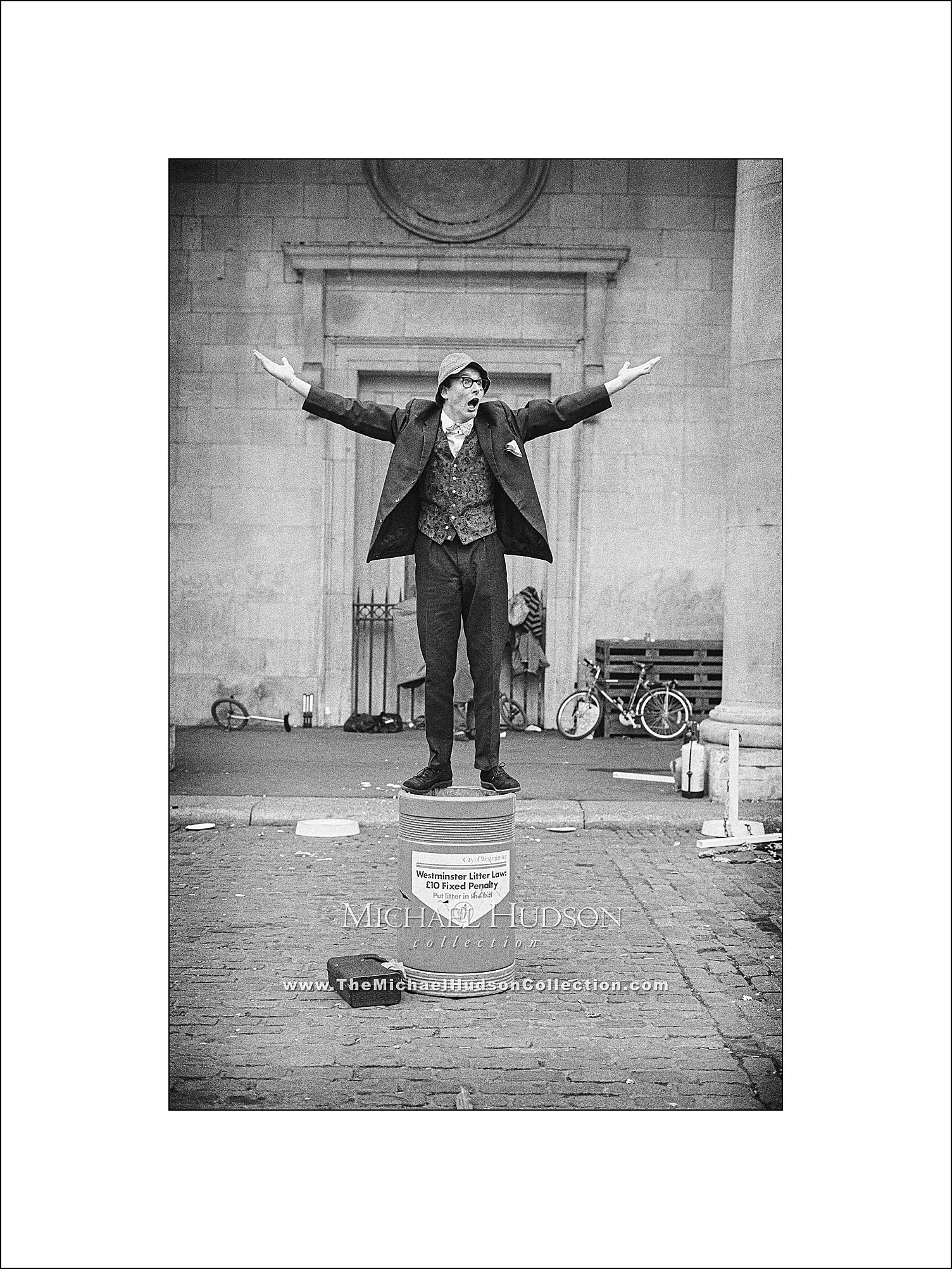 This image was made at the beginning of the performance, when the man stood on top of a rubbish bin to call his audience from all round Covent Garden market. I remember this performance as one of the best I’ve seen in Covent Garden. Six years later, in the summer of 1996, I caught his act again; he was still wearing the same waistcoat. In 1989, I used this image on the poster for my first solo exhibit.